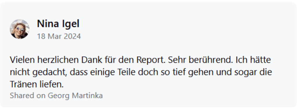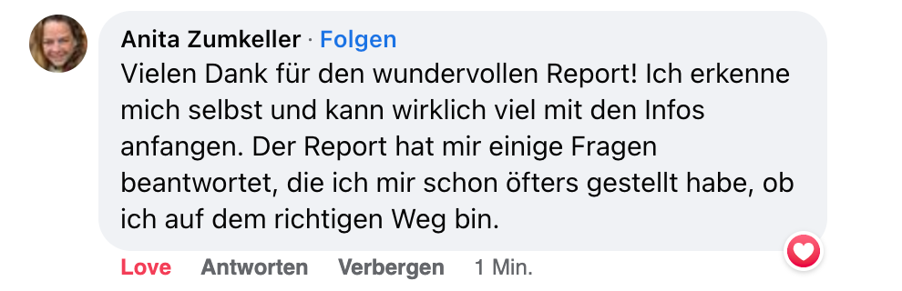 dass sie sich nach dem Report innerlich neu ausgerichtet und tief verstanden fühlen: