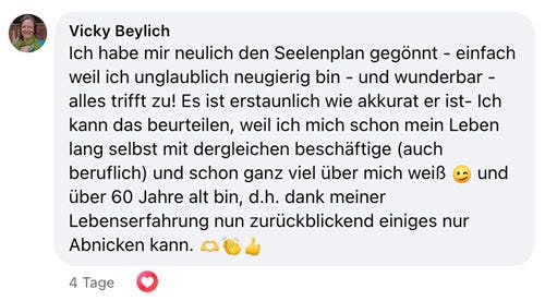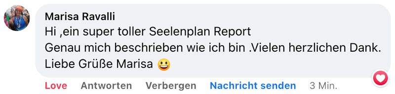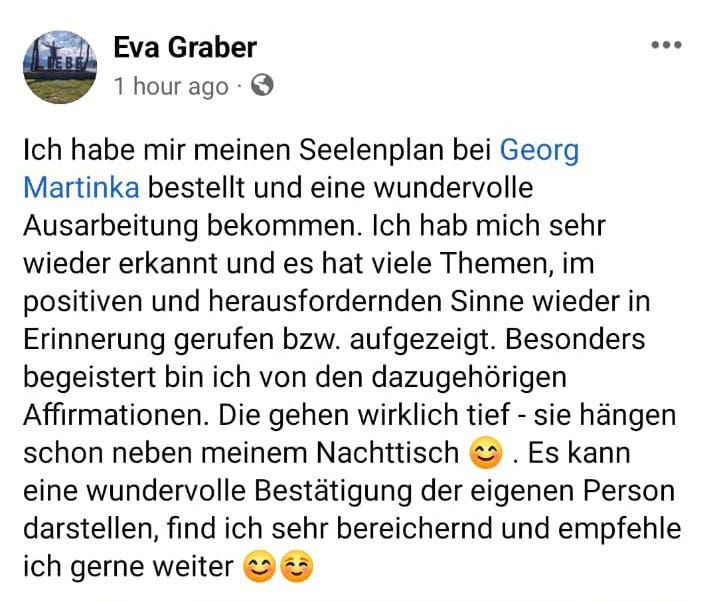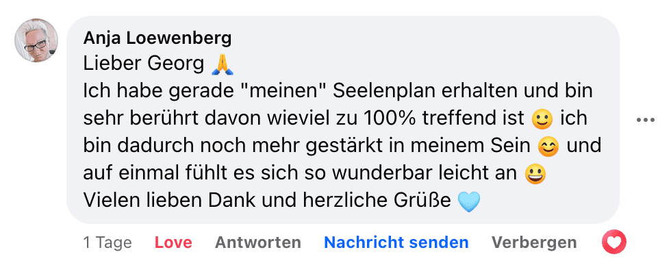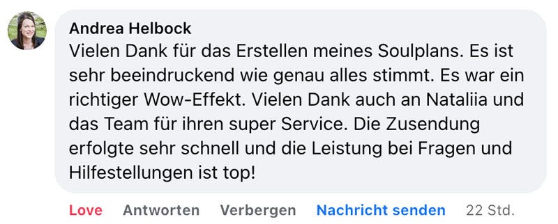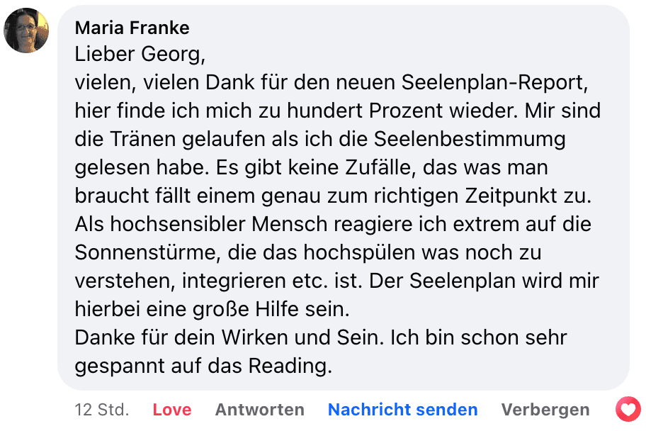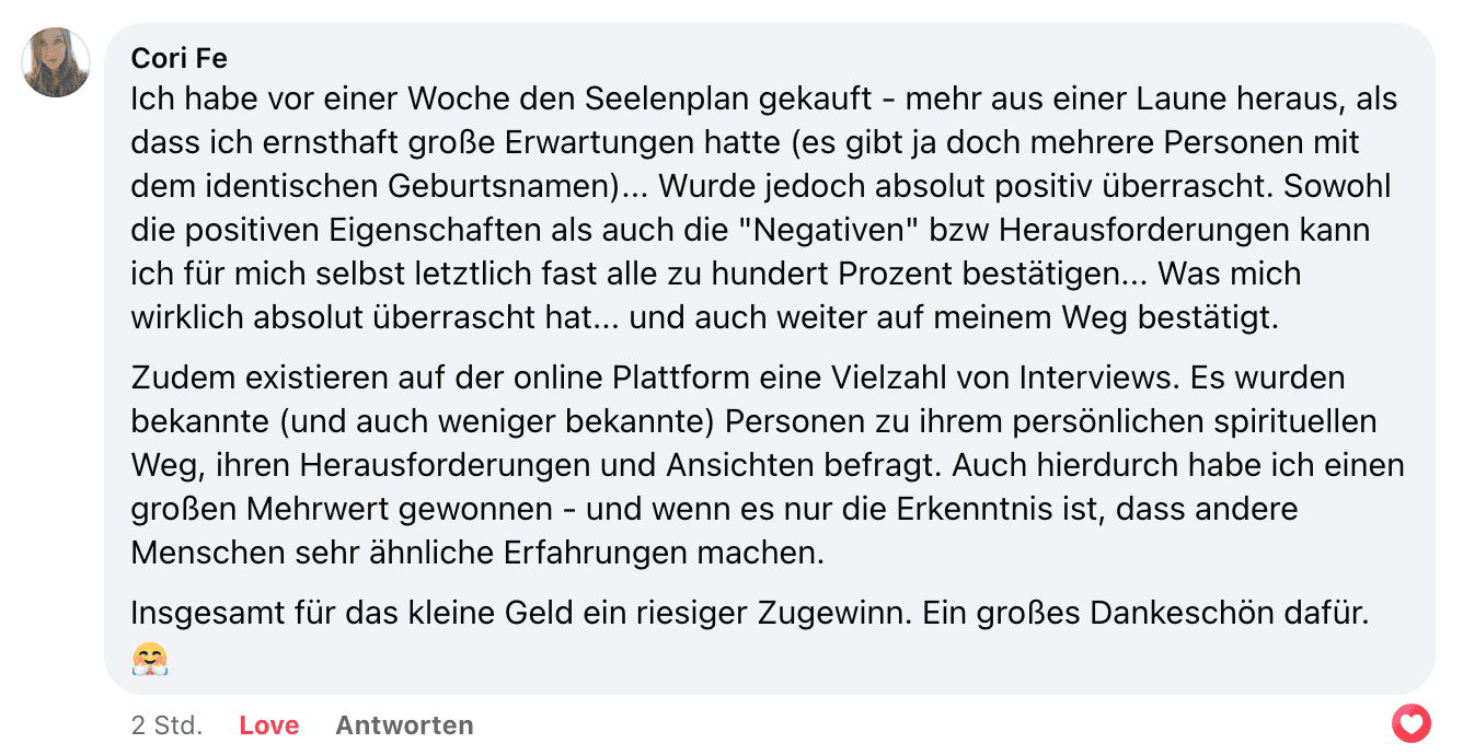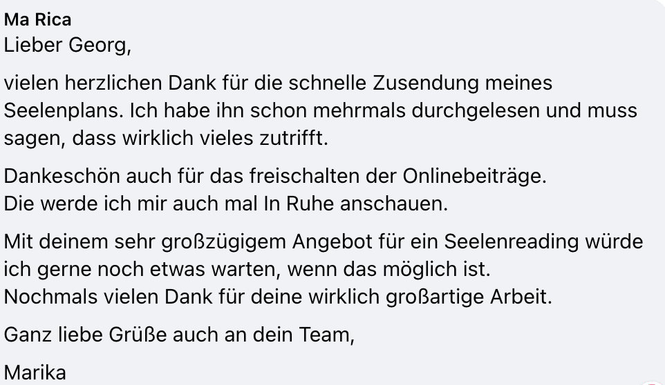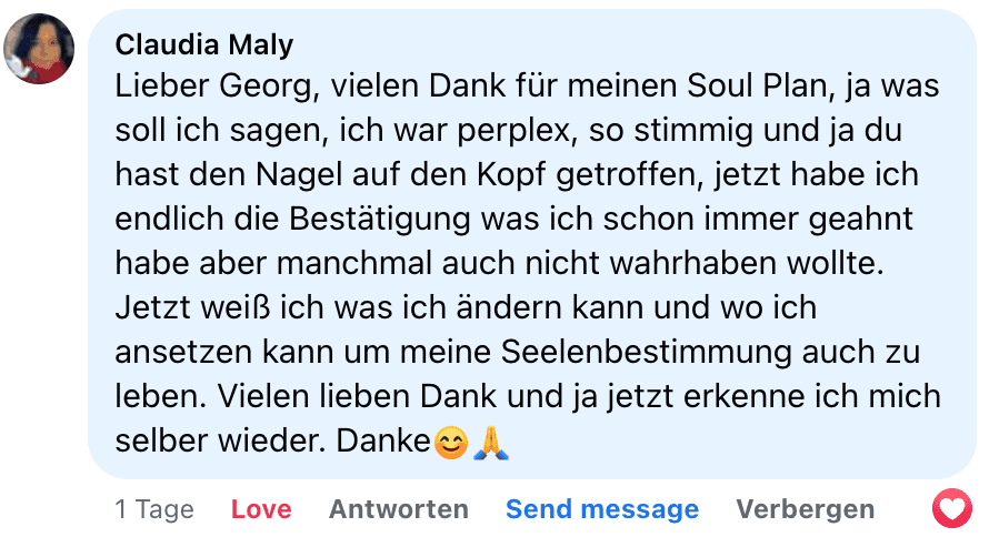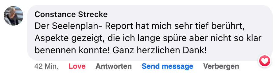 Rechtlicher Hinweis: Ich, dieser Report bzw. ein eventuelles späteres Reading stellen KEINE medizinische Beratung dar. Ich bin kein Mediziner und behaupte auch nicht, einer zu sein. Alle angebotenen Produkte und Inhalte, hier oder auf unseren Webseiten, sind KEIN Ersatz für eine professionelle medizinische Beratung, Diagnose oder Behandlung. Die Informationen, die ich gebe, sind generell nicht als professionelle Beratung in Bereichen wie Medizin, Psychologie, Finanzen oder Recht zu verstehen. Du solltest sie also nicht als Grundlage für wichtige Entscheidungen nutzen. Wenn Kunden Erfahrungen teilen, kann natürlich nicht garantiert werden, dass es bei dir genauso sein wird. Soul Plan ist eine Handelsmarke von Holistic Healing College. Es werden von uns ausschließlich Angebote und/oder Dienstleistungen von offiziell zertifizierten Soul Plan Practitionern angeboten.
