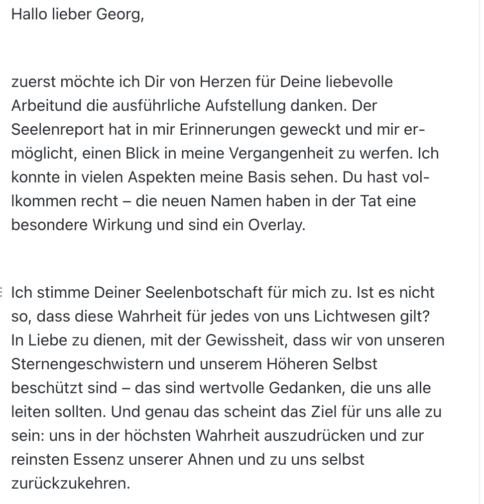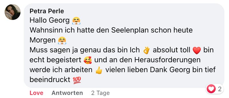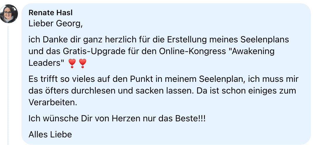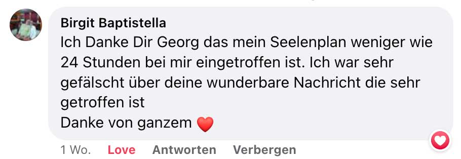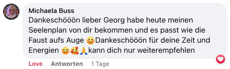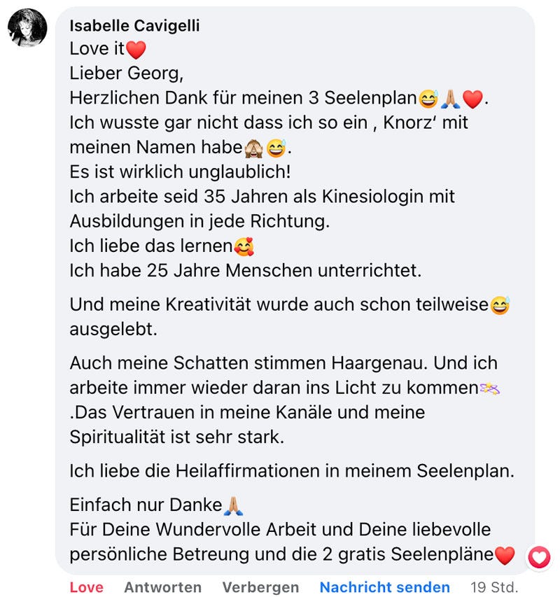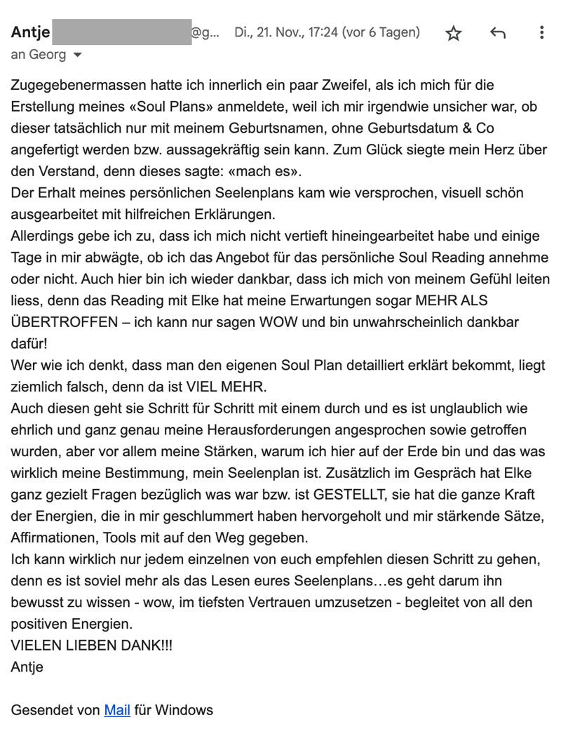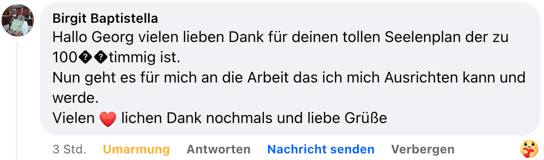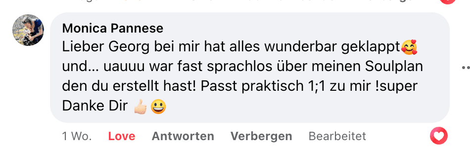 Rechtlicher Hinweis: Ich, dieser Report bzw. ein eventuelles späteres Reading stellen KEINE medizinische Beratung dar. Ich bin kein Mediziner und behaupte auch nicht, einer zu sein. Alle angebotenen Produkte und Inhalte, hier oder auf unseren Webseiten, sind KEIN Ersatz für eine professionelle medizinische Beratung, Diagnose oder Behandlung. Die Informationen, die ich gebe, sind generell nicht als professionelle Beratung in Bereichen wie Medizin, Psychologie, Finanzen oder Recht zu verstehen. Du solltest sie also nicht als Grundlage für wichtige Entscheidungen nutzen. Wenn Kunden Erfahrungen teilen, kann natürlich nicht garantiert werden, dass es bei dir genauso sein wird. Soul Plan ist eine Handelsmarke von Holistic Healing College. Es werden von uns ausschließlich Angebote und/oder Dienstleistungen von offiziell zertifizierten Soul Plan Practitionern angeboten.