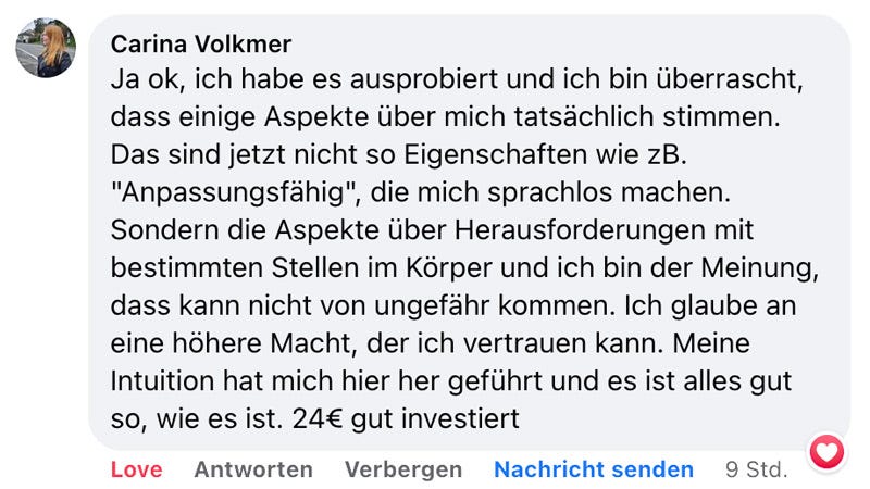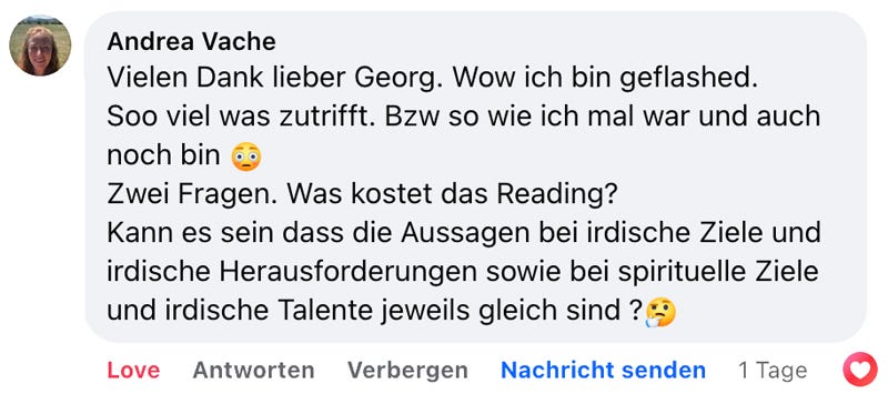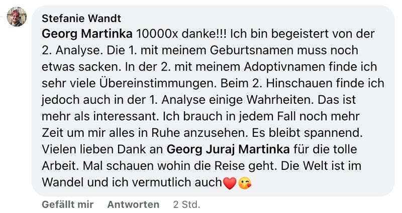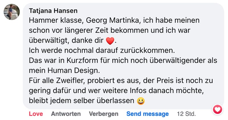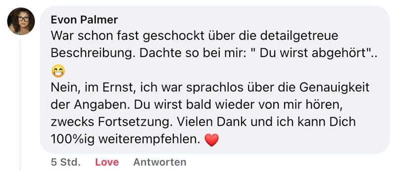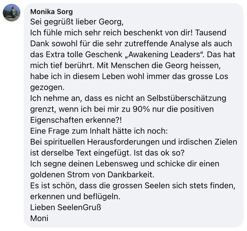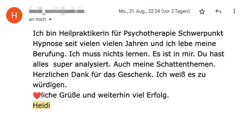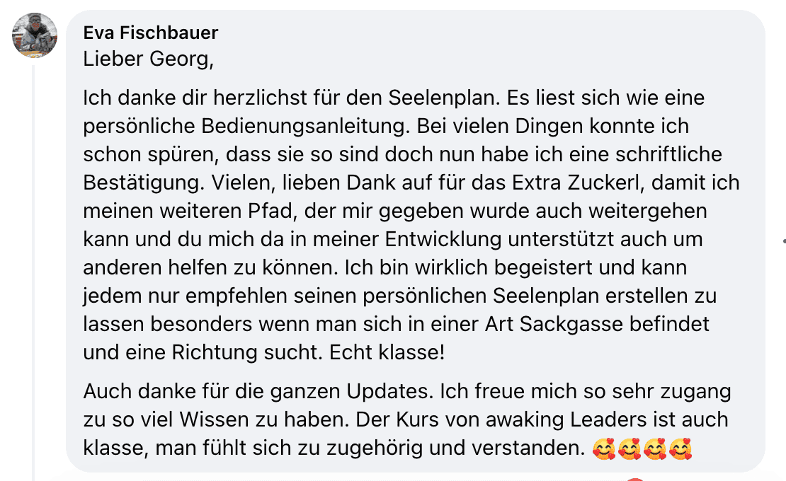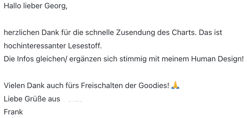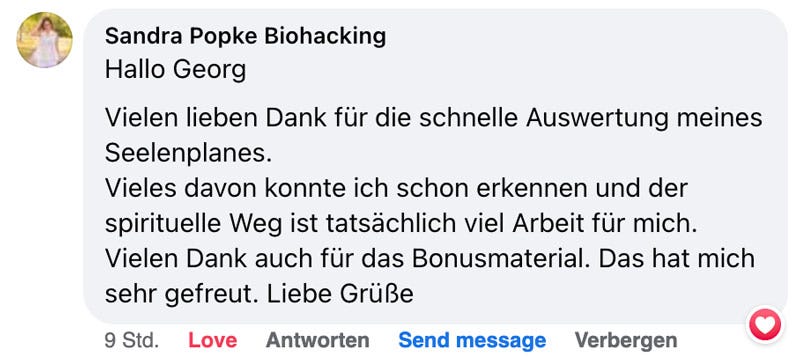 Rechtlicher Hinweis: Ich, dieser Report bzw. ein eventuelles späteres Reading stellen KEINE medizinische Beratung dar. Ich bin kein Mediziner und behaupte auch nicht, einer zu sein. Alle angebotenen Produkte und Inhalte, hier oder auf unseren Webseiten, sind KEIN Ersatz für eine professionelle medizinische Beratung, Diagnose oder Behandlung. Die Informationen, die ich gebe, sind generell nicht als professionelle Beratung in Bereichen wie Medizin, Psychologie, Finanzen oder Recht zu verstehen. Du solltest sie also nicht als Grundlage für wichtige Entscheidungen nutzen. Wenn Kunden Erfahrungen teilen, kann natürlich nicht garantiert werden, dass es bei dir genauso sein wird. Soul Plan ist eine Handelsmarke von Holistic Healing College. Es werden von uns ausschließlich Angebote und/oder Dienstleistungen von offiziell zertifizierten Soul Plan Practitionern angeboten.