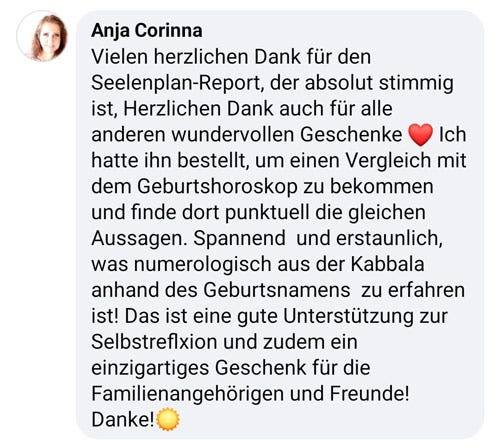 Der Seelenplan Report enthüllt die bedeutsamen, weltlichen sowie spirituellen Hindernisse, Talente, Begabungen und Bestrebungen, welche in diesem Leben auf dich einwirken. Mit diesem Wissen bist du imstande, besser abzuwägen und somit dein Leben in Einklang mit dem individuellen Plan deiner Seele zu gestalten. Ich erstelle max. 3 - 4 Reports pro Tag - die Zustellung erfolgt via Email, binnen 24h. Ich danke dir 🙏